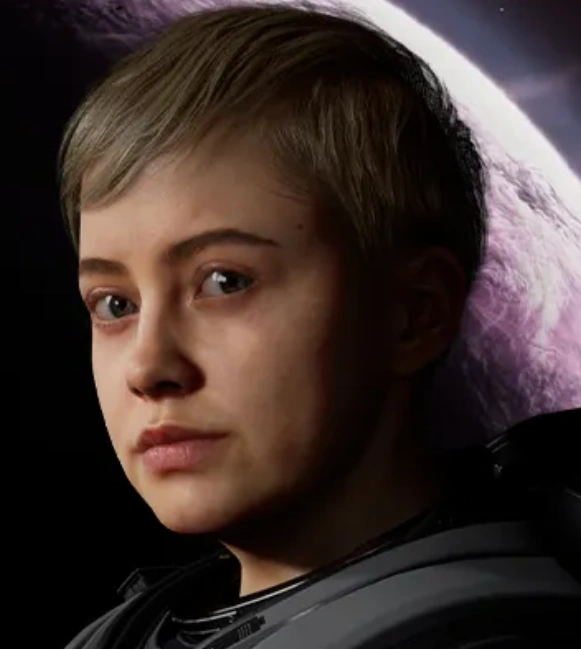 Anders is a young woman with fair, slightly tanned skin. She has gray-blue eyes and short blonde hair with a swept fringe.