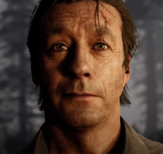 In the main story, Anthony is shown as an older man with wrinkled skin and brown hair. He has a hairstyle similar to his father's, with his hair combed back, making Anthony's forehead appear large. He also has burn marks on his left ear after a fire. Anthony wears a bus uniform from the "Ferrimen" company, which includes a gray shirt with two front pockets on the chest and three patches, black pants, and black boots. By the end of the game, Anthony suffers a wound above his left eye after a bus crash, and he becomes dirty as a result of walking around Little Hope.