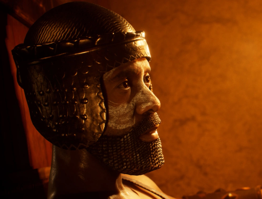 Balathu wears the standard garb of an Akkadian soldier, minus the half-faceplate. He wears studded leather armor and a helmet, and carries a khopesh. He has a postiche beard.