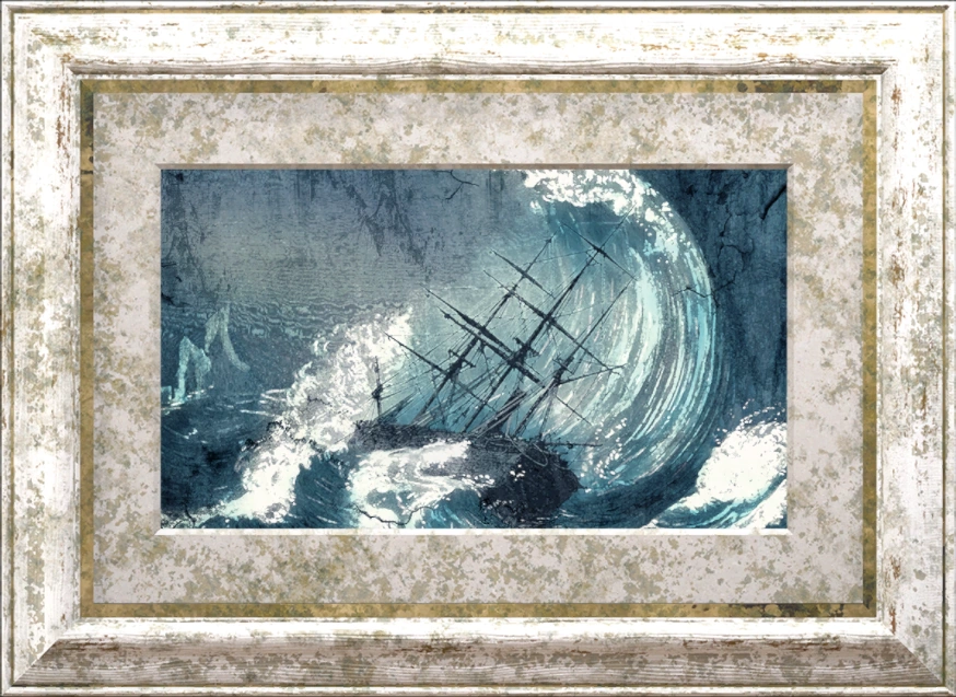 A white-bordered framed painting. It depicts a ship caught in a storm and about to be flushed by a huge wave.