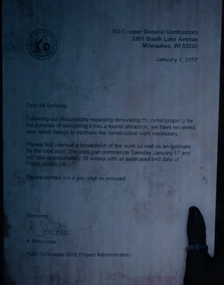 Construction Letter is a non-collectible item in The Devil in Me. It can be found by Jamie in the maintenance room. This item appears in Staff Only.