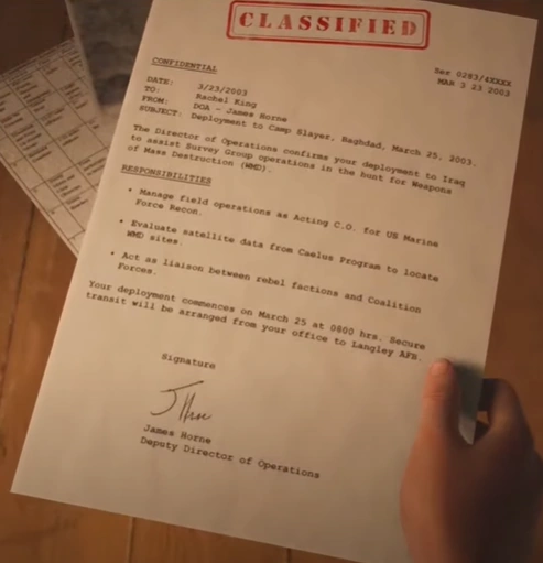 Deployment Letter is a non-collectible item in House of Ashes. It can be found by Rachel in her office. This item appears in the Curator's Cut of The Briefing.