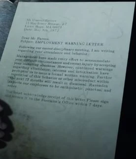 A letter to Vince about his attendance, lateness, and intoxication. On the back of the letter, he wrote "KISS MY ASS".