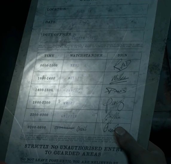 Guard Duty Schedule is a non-collectible item in Man of Medan. It can be found by Fliss or Brad in or above Cargo Hold 3. This item appears in Abandoned Ship, Danny, and Finding Friends.