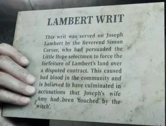 This writ was served on Joseph Lambert by the Reverend Simon Carver, who had persuaded the Little Hope selectmen to force the forfeiture of Lambert's land over a disputed contract. This caused bad blood in the community and is believed to have culminated in accusations that Joseph's wife Amy had been 'touched by the witch'.