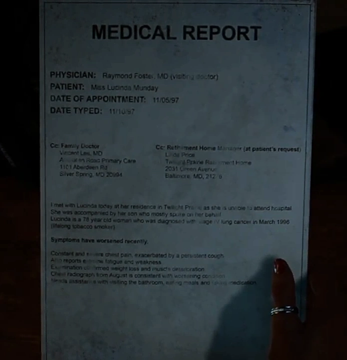 A medical report. In late 1997, Lucinda Munday was dying from lung cancer.