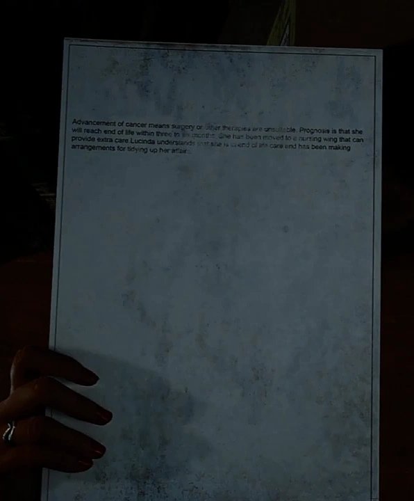 Lucinda understands that she is in end-of-life care and has been making arrangements for tidying up her affairs.