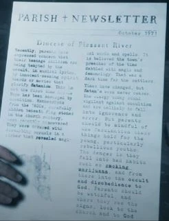 A parish newsletter warns against the occult and discusses how the town's puritan forebears dabbled in magic and demonology as demonstrated by manuscripts recently discovered under flagstones in the church rectory. The newsletter assures that the clergy of the 1970s would not fall to the same temptations, but warns that children are in danger.