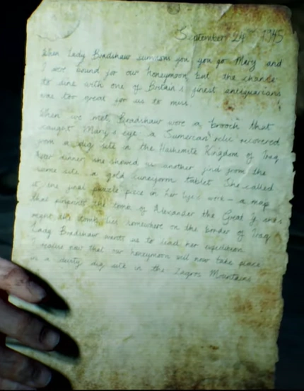 When we met, Bradshaw wore a brooch that caught Mary's eye: a Sumerian relic recovered from a dig site in the Hashemite Kingdom of Iraq. After dinner, she shows us another find from the same site, a gold cuneiform tablet. She called it the final puzzle-piece in her life's work - a map that pinpoints the tomb of Alexander the Great. If she's right, the tomb lies somewhere on the border of Iraq.