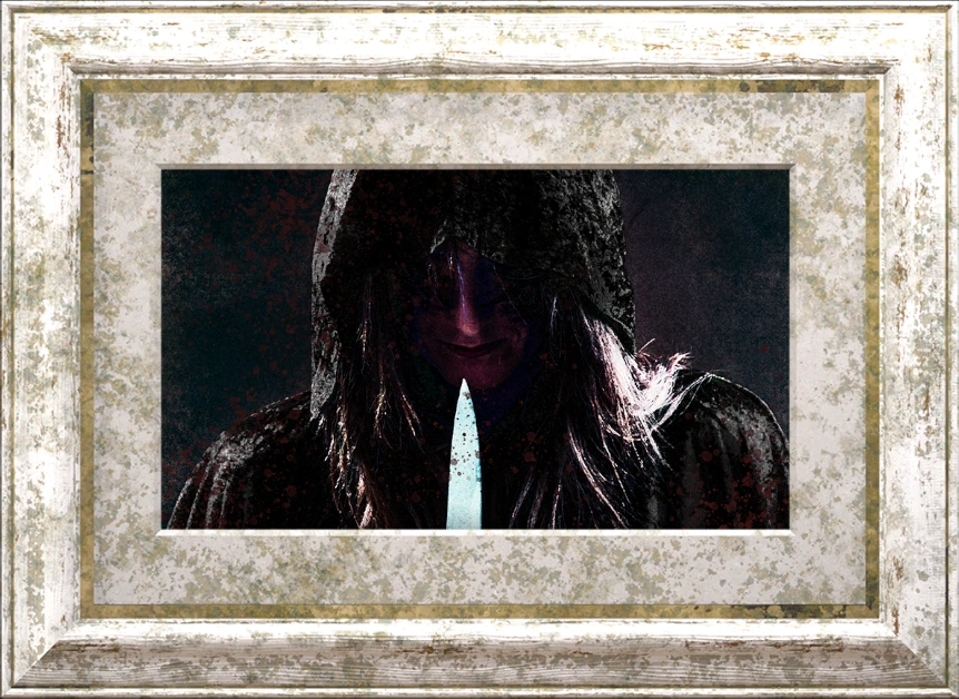 A postcard. The front page depicts a menacing woman in a black cloak holding a blade.