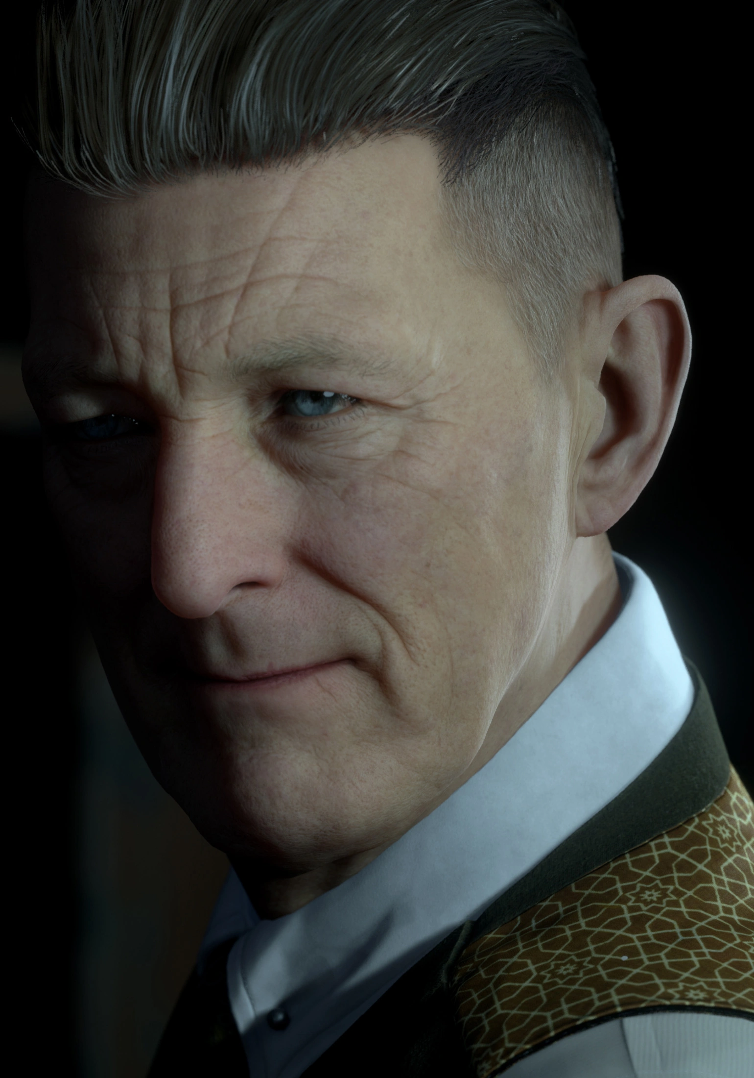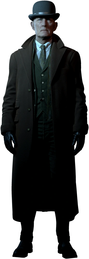 Above those pieces of clothes, The Curator also wears a brown and long trench coat, a green patterned scarf, a grey bowler hat and brown leather gloves during the intro sequence of the Dark Pictures Anthology's entries and his background presence.