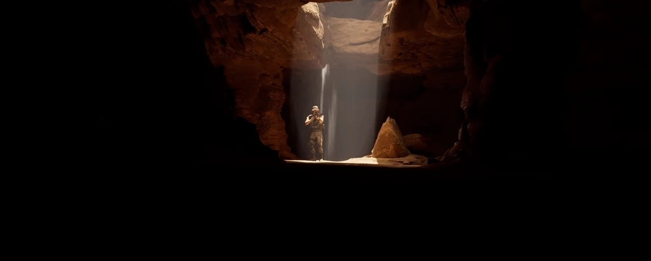 After the earthquake, Jason falls into the sand caverns. He tries to call the rest of the squad, but gets no signal. Jason lights a flare and throws it into the dark tunnel before walking through. On the way, he hears Nick's voice in the other side and responds, and also clicking sounds, to which he responds how it doesn't sound promising. After reaching the end of the tunnel, Jason jumps down and reaches a structure.