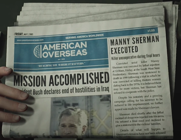 A newspaper. It contains articles about President George W. Bush declaring the end of hostilities in Iraq, the execution of serial killer Manny Sherman, and an advertisement of the "Singing Nickel" beer brand.